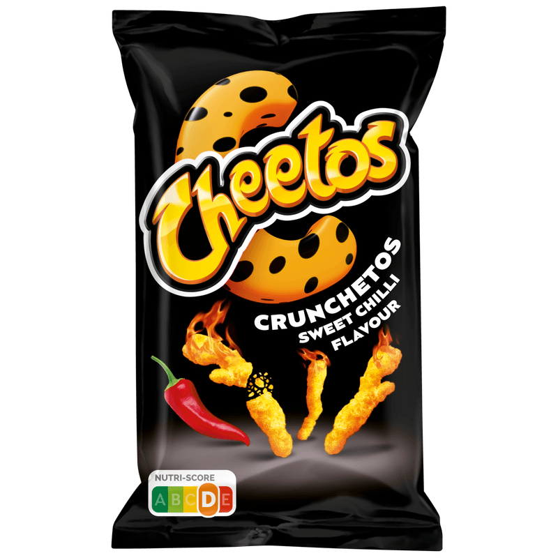 Ingrediënten: maïs, koolzaadolie, zoete chilismaak [suiker, weipoeder (van MELK), zuurteregelaars (natriumcetaten, appelzuur), smaakversterkers (mononatriumglutamaat, dinatrium-5′-ribonucleotiden), zout, uienpoeder, gehydrolyseerde plantaardige eiwitten (bevat SOJA), aroma’s, kaliumchloride, knoflookpoeder, kleurstof (paprika-extract)]. Kan pinda en tarwe (gluten) bevatten.